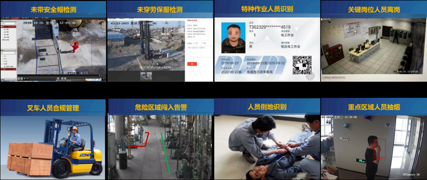 基于视频 AI 分析技术,可实现人员行为监测(如未带安全帽、未穿劳保服、特种作业人员识别、关键岗位人员离岗、危险区域闯入、人员倒地、重点区域人员抽烟)、设备隐患检测、环境状态监测(如明火检测、烟雾监测、漏油检测)、产品质量检测;还能进行智能读表、指示灯识别、阀门开闭识别、空气开关状态识别。